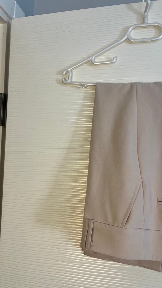 Bej renk, pilili, midi boy, düz kesim kadın kumaş pantolon. Ofis için uygun, minimalist tarzda, yumuşak sentetik kumaştan yapılmıştır.