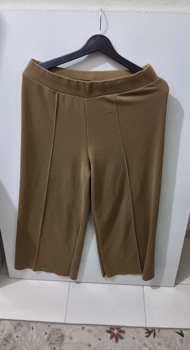 Kadın bej kumaş pantolon, bol kesim ve pilili detaylarla midi boydadır. Sentetik kumaştan yapılmış, rahat ve sade bir sokak stili sunar.