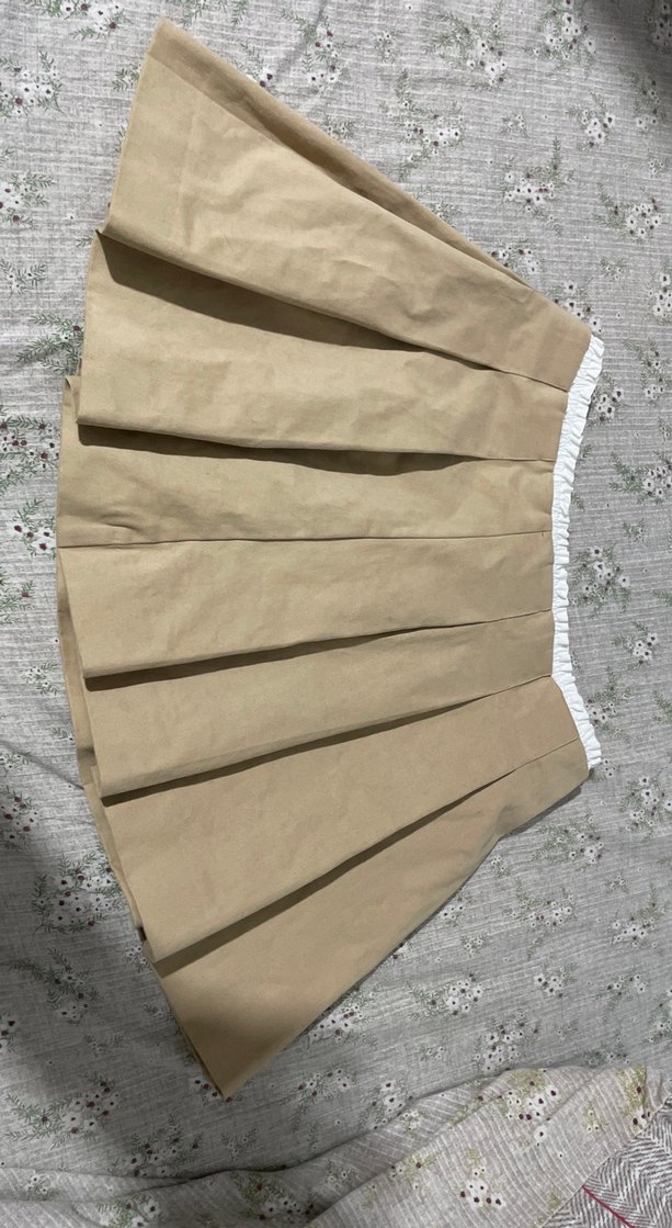 Bej renkte, pilili ve bol kesim kadın mini etek. Sentetik kumaştan yapılmış, normal midi boyda ve minimalist normcore tarzında, günlük kullanım için uygundur.