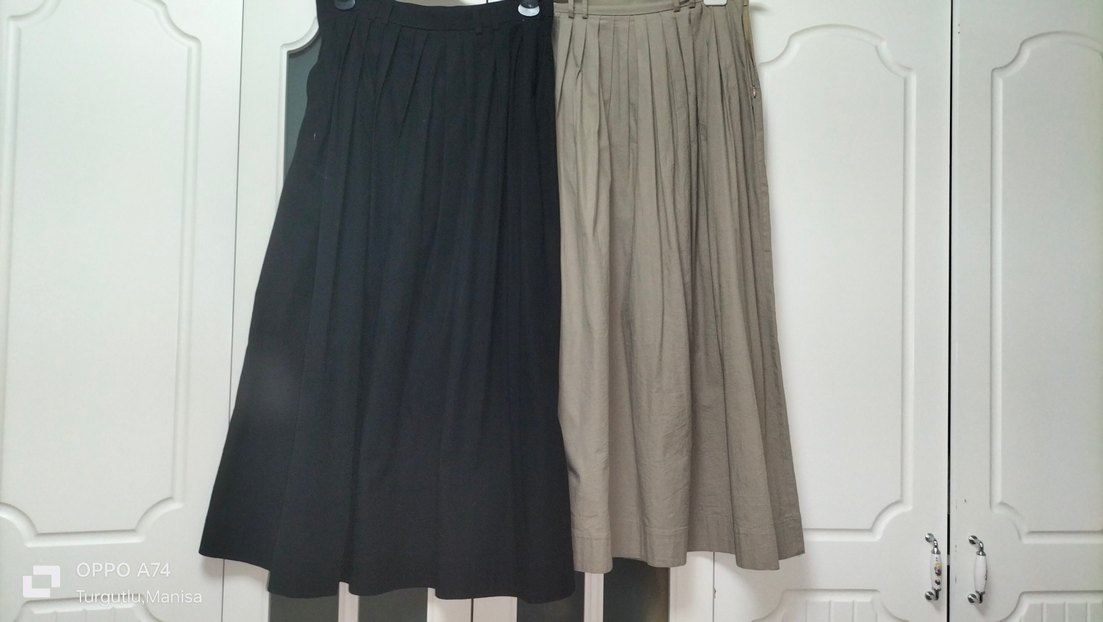 Kadınlar için pilili, pamuk kumaştan, siyah ve bej renkte, midi boyda ve bol kesim etek. Ofis için uygun, minimalist ve normcore tarzda.