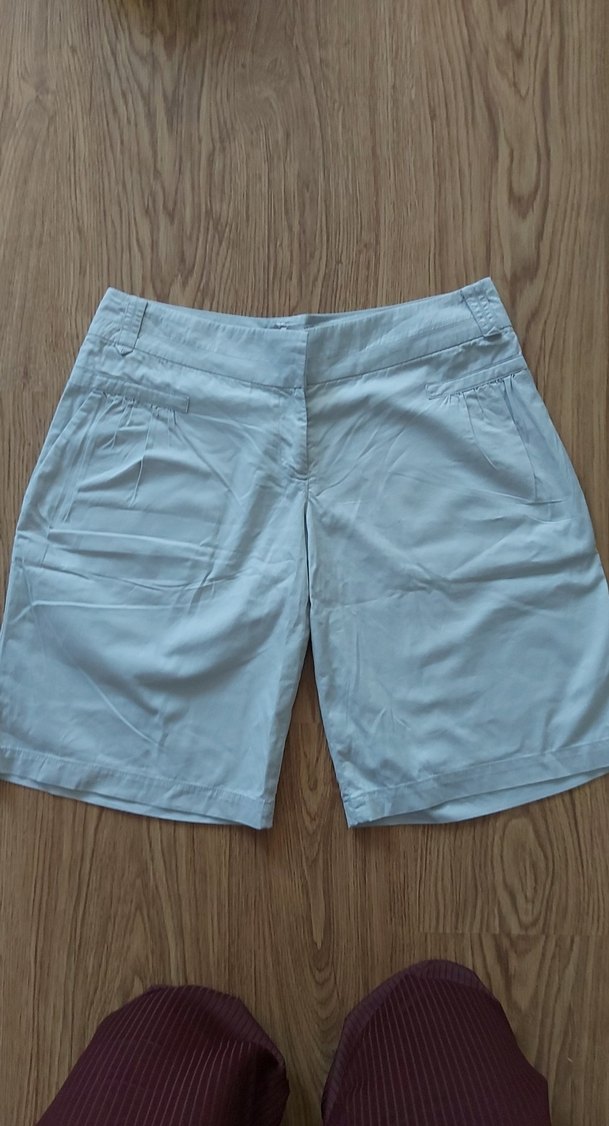Kadınlar için bej renkli, pamuk kumaştan yapılmış, rahat kesim Bermuda şort. Düz ve desen içermeyen tasarımıyla gündelik dış mekan kullanımı için uygundur. bel 42 cm boy 51 cm