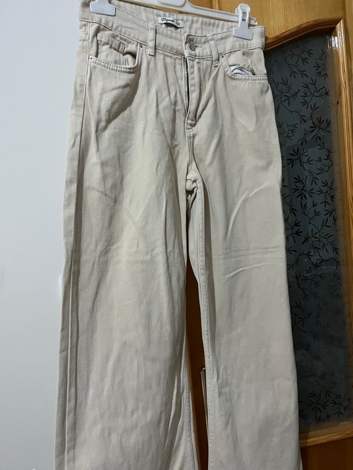 Bej renkli, keten kumaştan, rahat kesim ve normal boyda, günlük kullanıma uygun şık ve rahat kadın pantolonu.