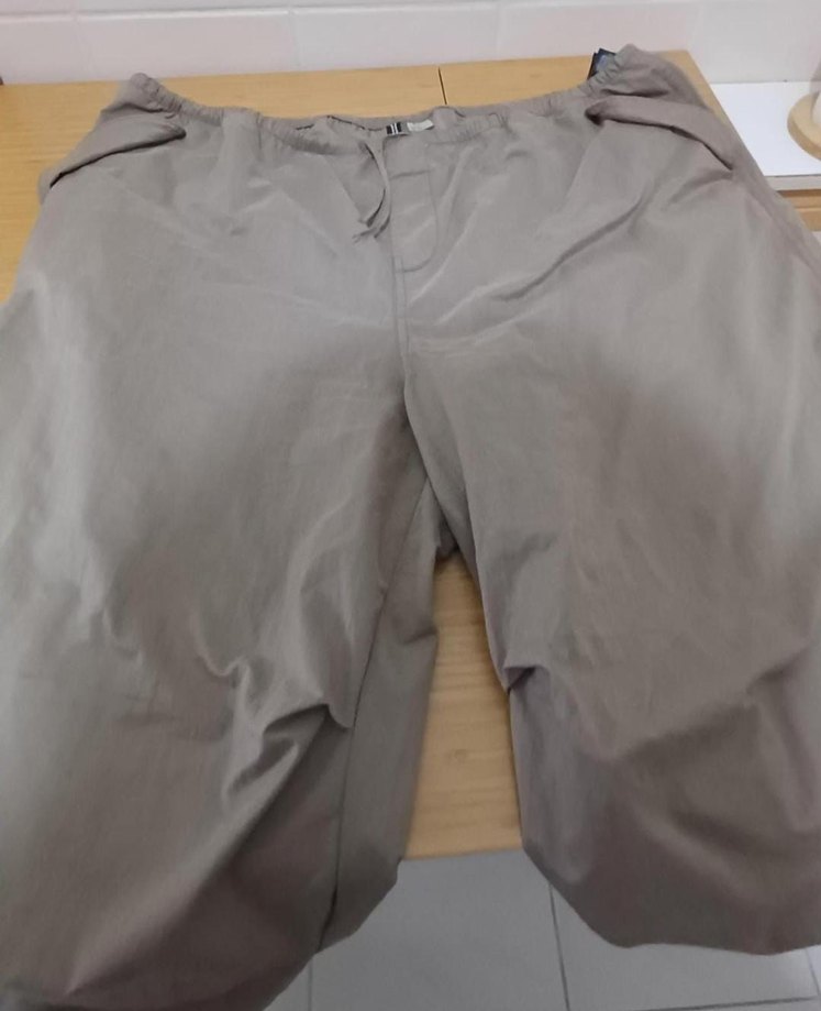 Kadın bej renkli, sentetik kumaştan üretilmiş, rahat kesim ve midi boyda kumaş pantolon. Dış mekan ve sokak stili için uygundur.