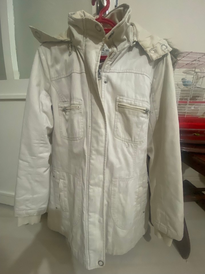 Kadınlar için fermuarlı, uzun kollu, normal midi boyda, pamuklu kumaştan yapılmış bej rengi kapüşonlu şık kaban