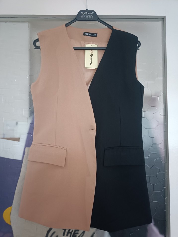Düğmeli, normal boy, kolsuz yelek. Bej ve siyah renk bloklu, sentetik kumaştan, iş ortamına uygun. Yelek sıfır ve etiketlidir. S bedendir ancak M bedene de uyumludur.