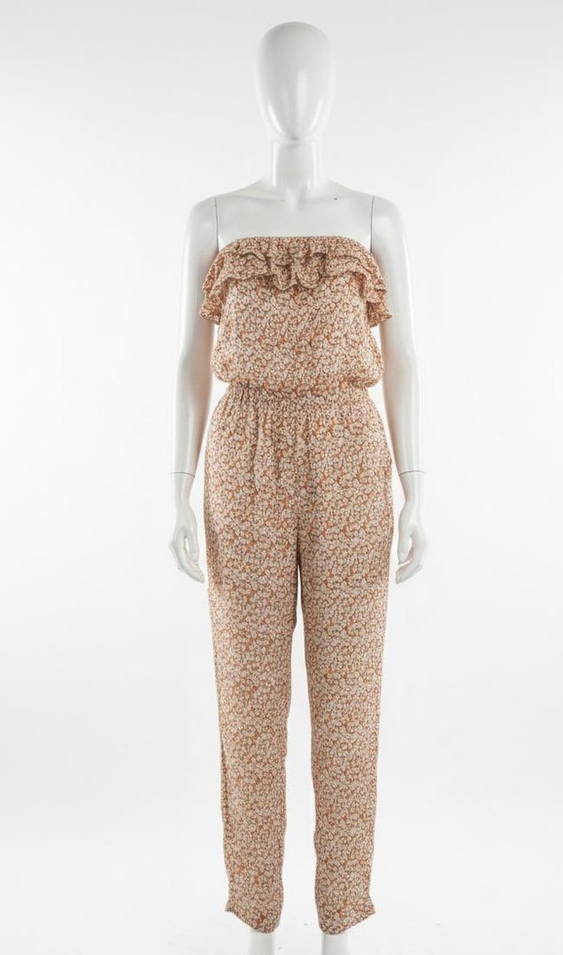 Bej renkli, straplez ve fırfırlı detaylara sahip bol kesim tulum. Hafif batik deseniyle, günlük kullanıma uygundur. (Rengi solmuş biraz.)