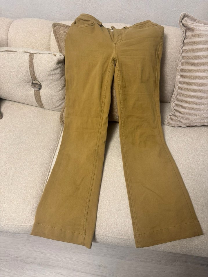 Kadınlar için bej süet kumaştan, kemerli ve parlak görünümlü normal boyda, regular fit pantolon. Günlük kullanıma uygun rahat normcore tarzında.