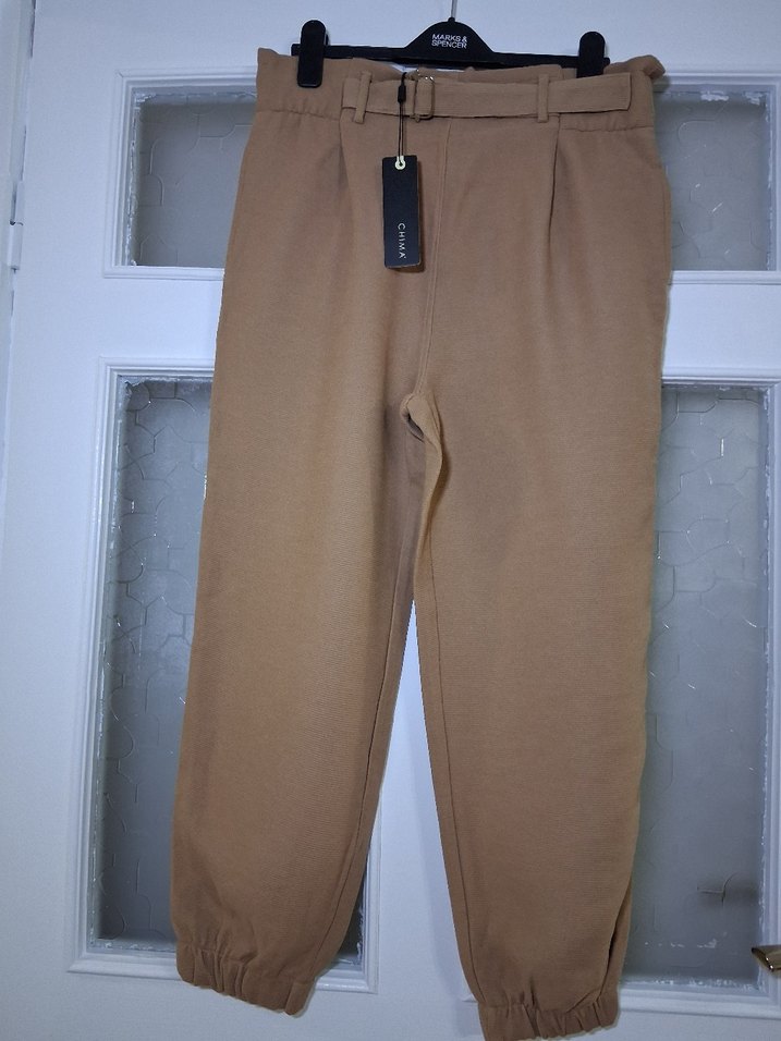 Kadınlar için bej renk eşofman, kemerli ve bol kesim midi boy pantolon tarzda Elastik paçalarıyla günlük rahat sokak stili için uygundur. 40 beden M ve L beden uyumlu