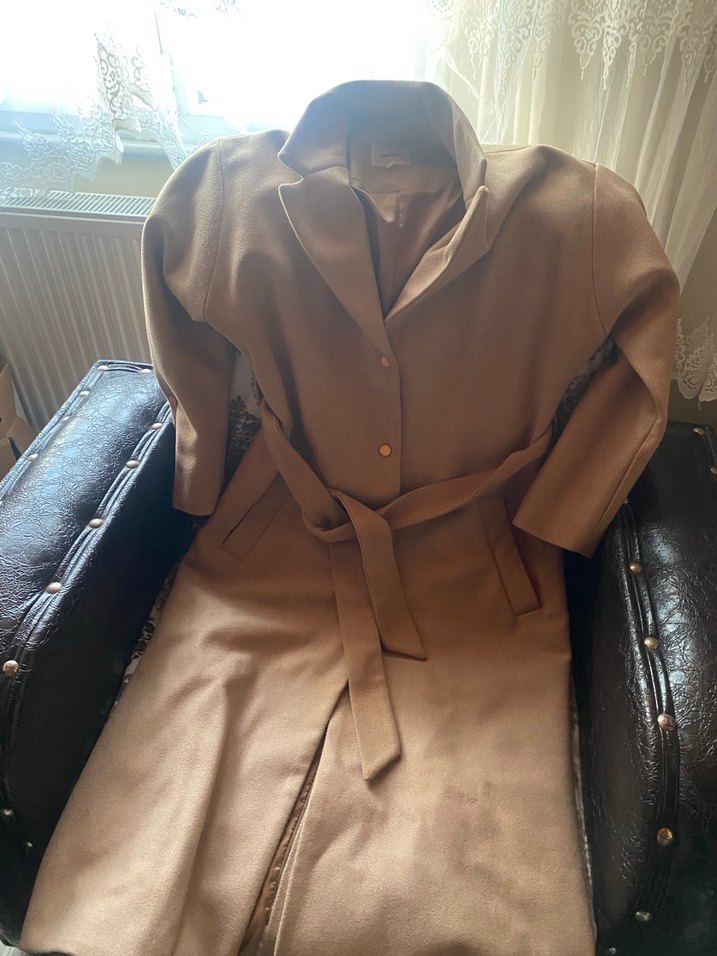 Bu kadın uzun kaban, kemerli bel ve kesik yaka tasarımıyla dikkat çeker. Bej renkte süetten yapılmış, rahat kesim ve uzun kolludur. 1 kez kullanıldı