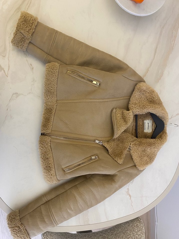 Bej süet kumaştan, kürk detaylı, uzun kollu ve normal boyda, kadın ceket. Sokak tarzı ve günlük kullanım için uygundur. S beden birine uygun olacaktır. İnanılmaz sıcak tutuyor. Kolunda küçük defoları var.