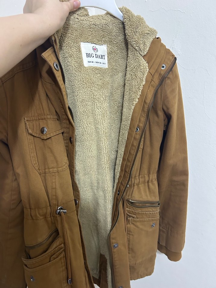 Bej süet ceket, içi kürklü ve bol kesimdir. Uzun kollu, yakası kesik ve çoklu ceplidir. Günlük sokak stiline uygundur. Marka BIG DART.