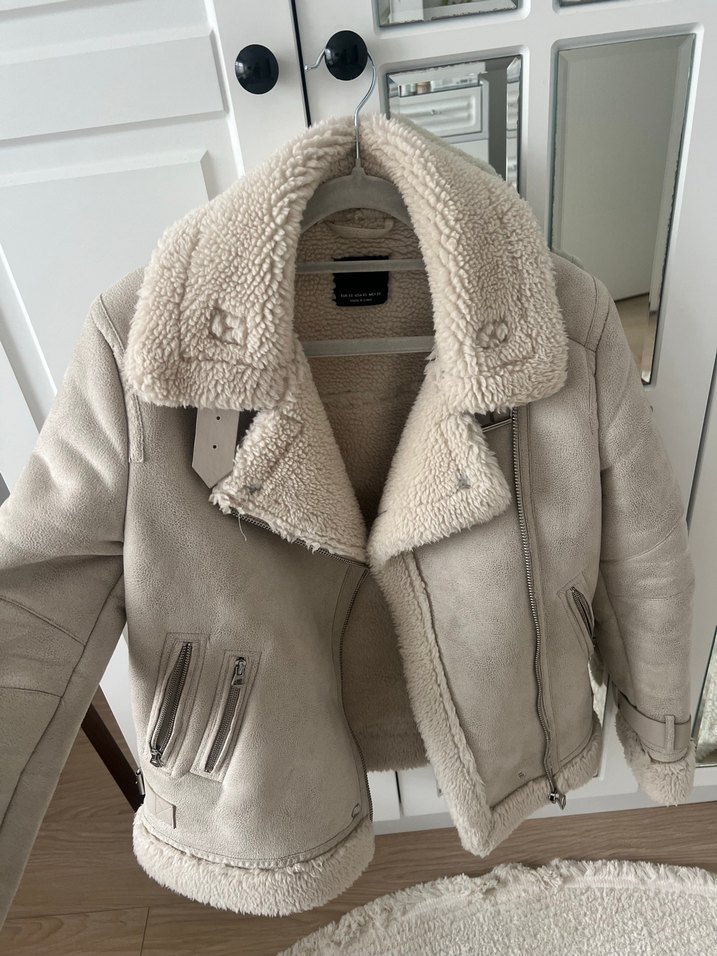 Bej süet kumaştan yapılmış, kürk detaylı, fitted kesim, notched yaka ve strappy kollu kadın kışlık ceket. Rahat ve şık midi uzunlukta, sokak modasına uygun.