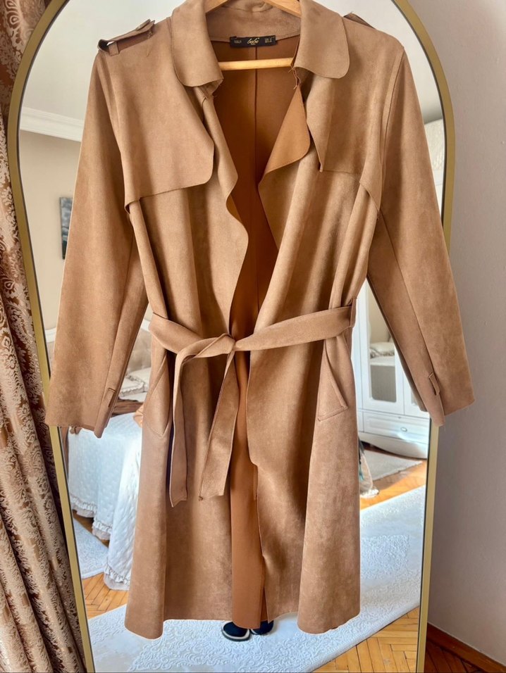 Bej süet midi trenchcoat, kesik yaka ve kuşaklı bel detayına sahiptir. Uzun kollu, parlak yüzeyli ve rahat kesimdir.