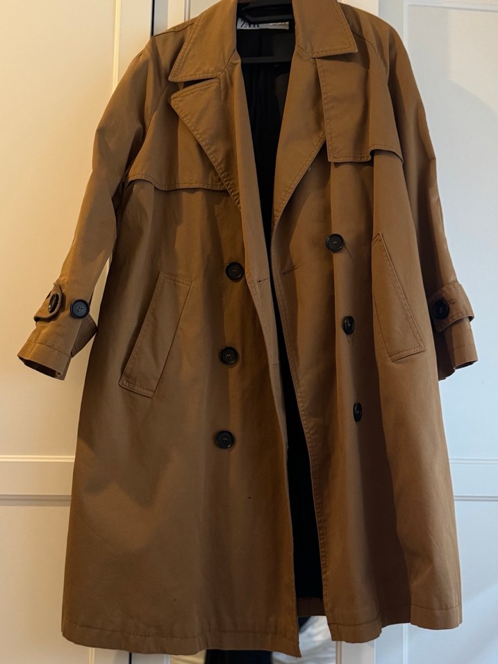 Bej renkli, süet kumaştan uzun boy trençkot. Düğmeli, açık yakalı, bol kesim ve uzun kollu. Paris sokak modasına uygun, günlük kullanıma elverişli.