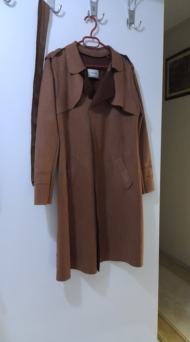 Bej renkte, süet kumaştan uzun trençkot. Notlu yaka ve kemerli, regular fit kesim, uzun kollu, günlük kullanım için uygundur.