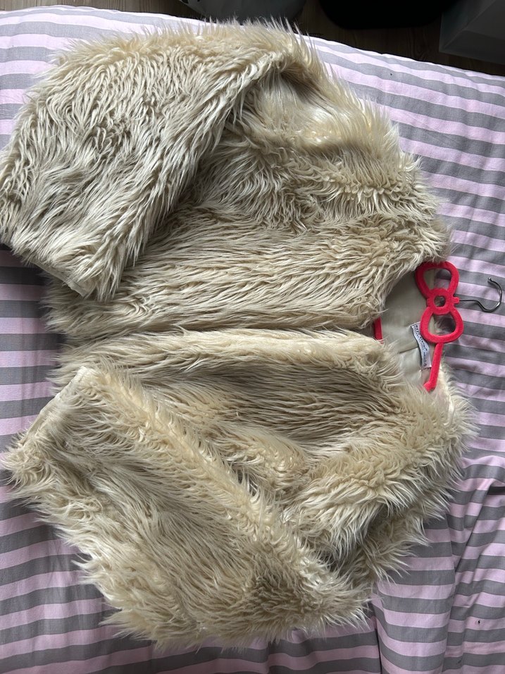 Bej renkli, suni kürk midi ceket, uzun kollu ve yakası kesik detaylıdır. Yumuşak sentetik kumaştan yapılmış, rahat ve bohem tarzda dış mekan kullanımı için uygundur.