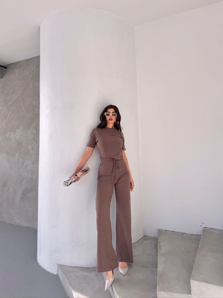 Kadın bej takım , kısa kollu ve yuvarlak yakalıdır. İpeksi kumaştan üretilmiş, günlük kullanıma uygun, sade ve şık bir tasarıma sahiptir. Fitilli kumaş