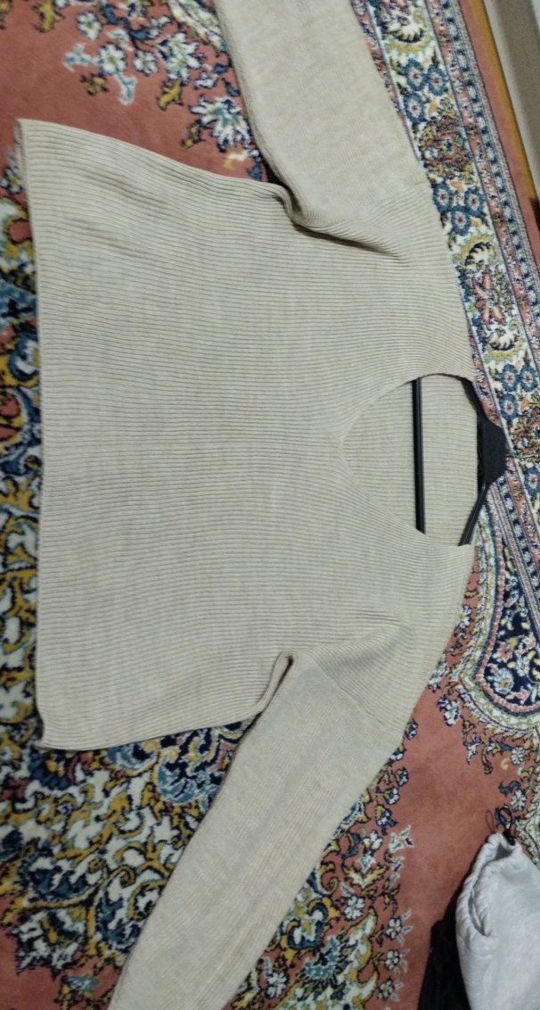 Kadın bej renkli, triko dokulu, uzun kollu ve kayık yaka kazak. Rahat ve bol kesimli, midi boyda, bohem tarzda, günlük kullanıma uygun.