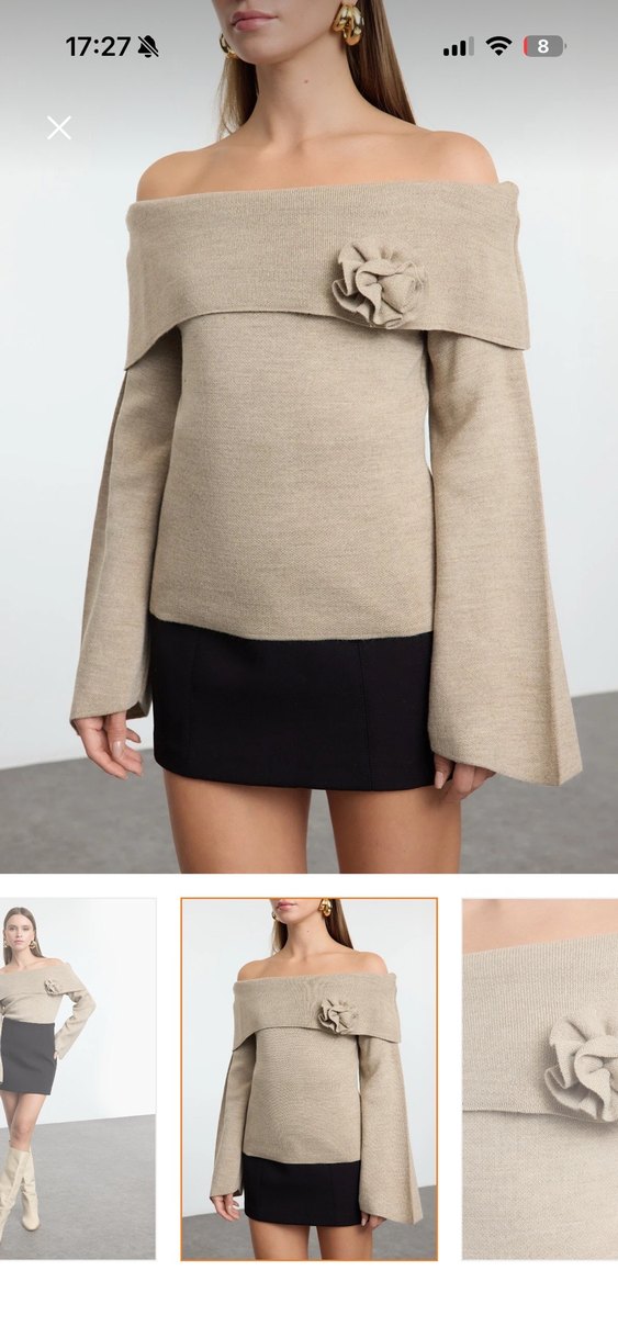 Bej renkli, straplez, uzun kollu ve bol kesim kadın triko kazak. Sentetik kumaştan örülmüş, minimalist ve desensiz tasarıma sahiptir, çiçek detaylı. Günlük kullanım için uygundur.
