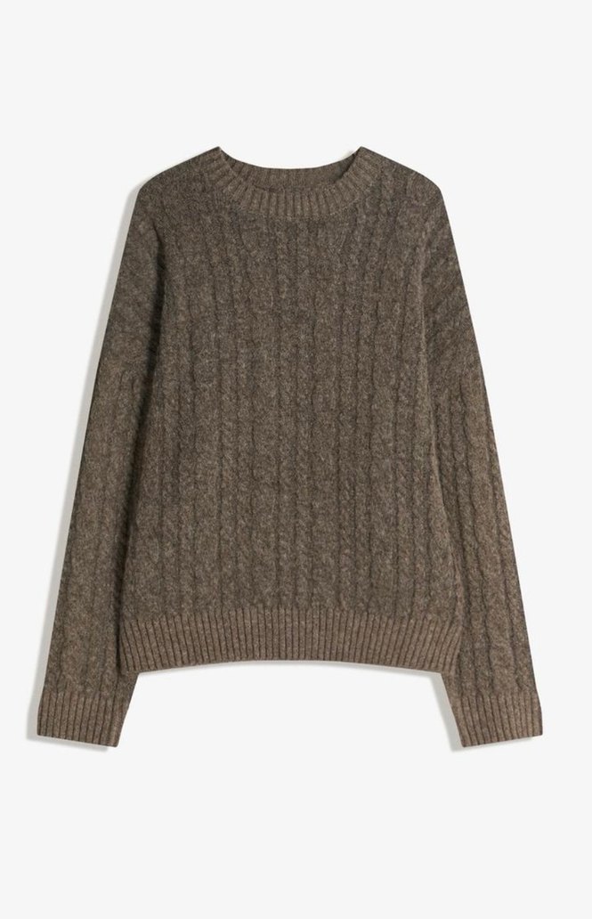 Kadınlar için triko yün kumaştan, bej renkte, bisiklet yaka ve uzun kollu kazak. Normal kesim ve midi boyda, günlük kullanım için uygundur.