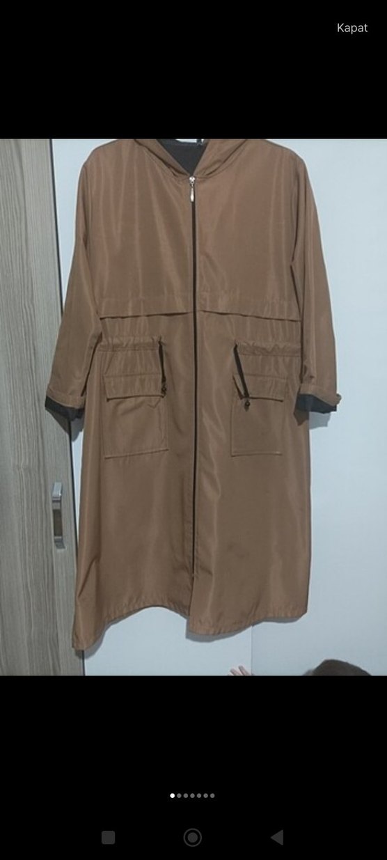 Kadın bej uzun boy yağmurluk, bol kesim, uzun kollu ve yaka detaylıdır. Kemerli ve cepli, sentetik kumaştan günlük kullanım için uygundur. ☔