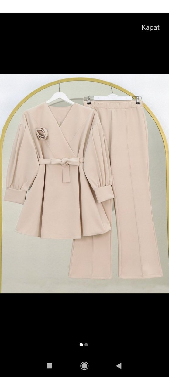 Bej renkli kadın takımı, kemerli ve çiçek detaylı uzun ceket ile düz kesim pantolondan oluşur. Strappy kollu, sentetik kumaştan, ofis için uygundur.