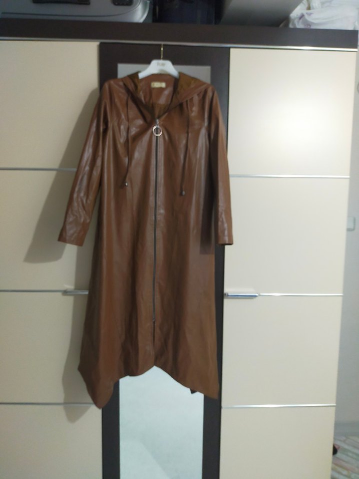 Kadınlar için uzun, bej renkli deri kaban, kemerli ve çentikli yaka detaylıdır. Salaş kesimi ve uzun kollarıyla günlük sokak stiline uygundur.