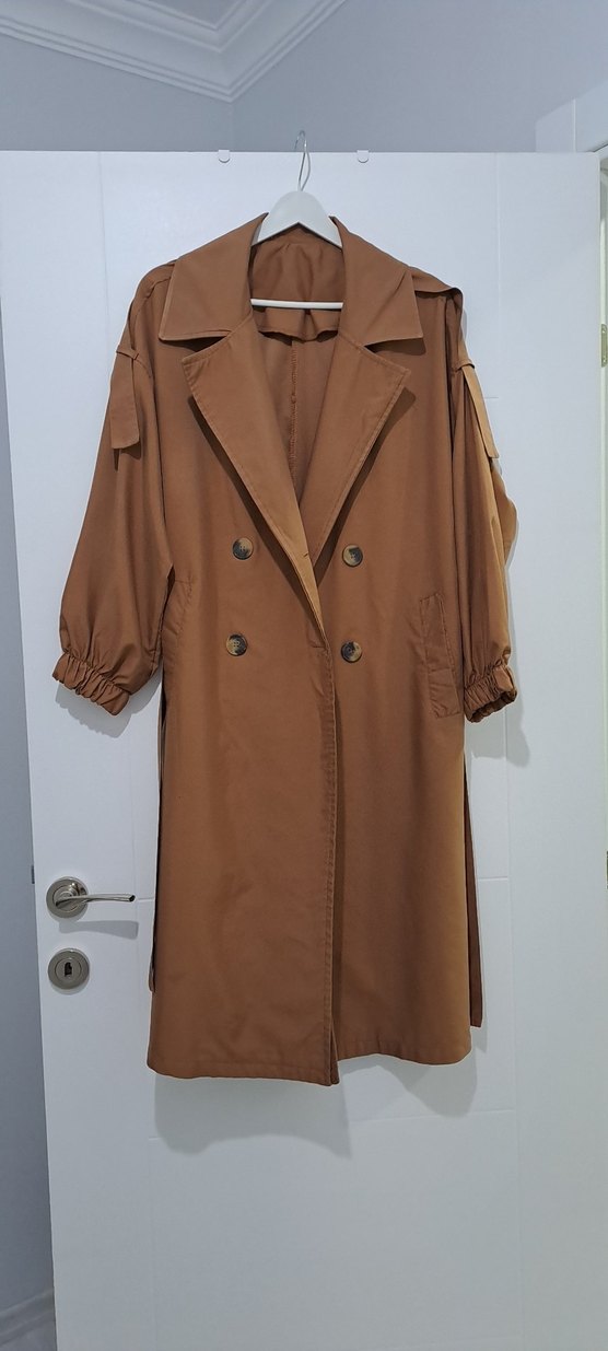 Kadın bej uzun trençkot, düğmeli, notlu yaka ve uzun kolludur. Sentetik kumaştan, rahat ve salaş kesime sahiptir.