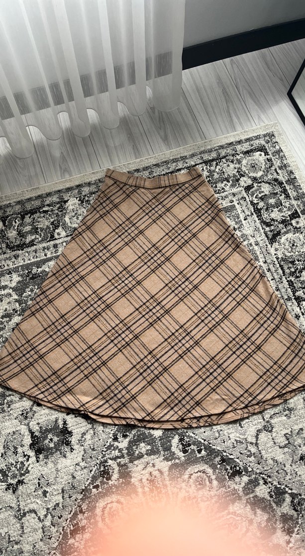 Kadınlar için bej renkte, ekose desenli ve bol kesim uzun etek. Sentetik kumaştan, günlük kullanıma uygun rahat bir model.