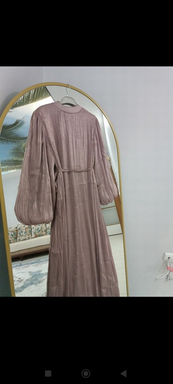 Bej renkte, keten kumaştan uzun ve pilili kadın elbisesi. Bol kesim, uzun kollu ve yüksek yakalı, sade ve rahat bir tarz sunar.