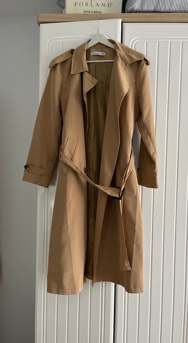 Bej renkli, uzun keten trençkot; açılı yaka, kuşaklı bel ve uzun kolludur. Düzenli kesimi ve desensiz tasarımıyla günlük rahat sokak stili için uygundur.