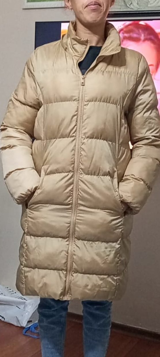 Fitted kesim bej renkli uzun kışlık mont, uzun kollu şapkası yoktur boy 90 iki kol arası 50