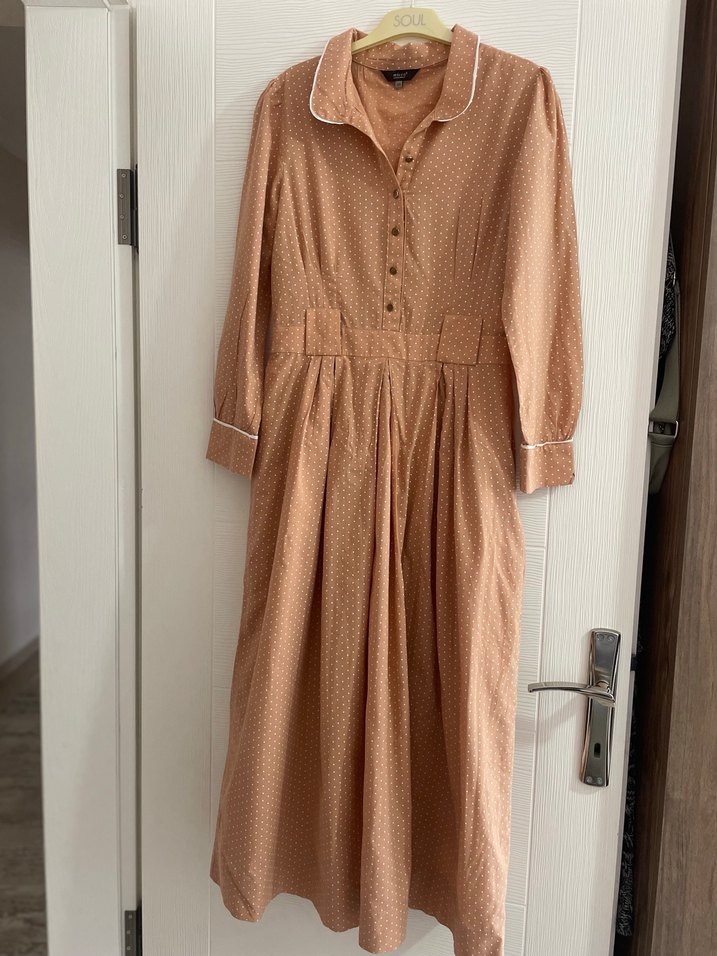 Bej renkli, pamuklu kumaştan, uzun kollu, düğmeli, yakalı ve bol kesim vintage tarzda kadın uzun elbise. Ofis kullanımı için uygundur. Astarlıdır. Boy 1.28 cm göğüs 46cm kol boyu 59cm
