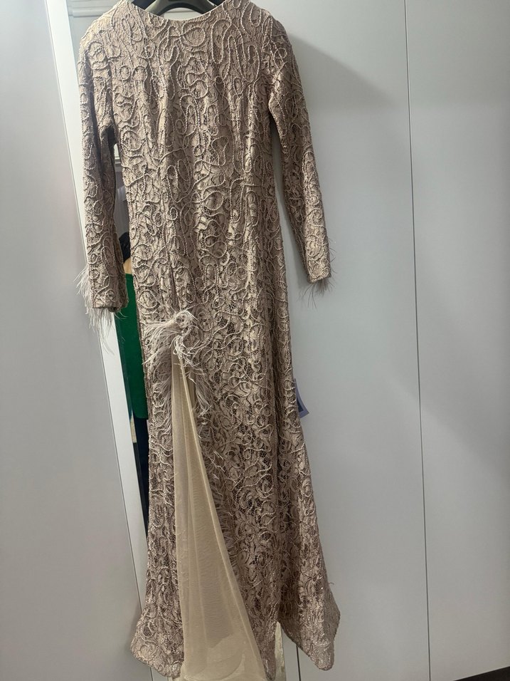 Bej renkte, uzun kollu ve tek parça, modern klasik stil abiye elbise. Kürklü detaylar ve tek renk, düğünler için uygun, rahat kesim.