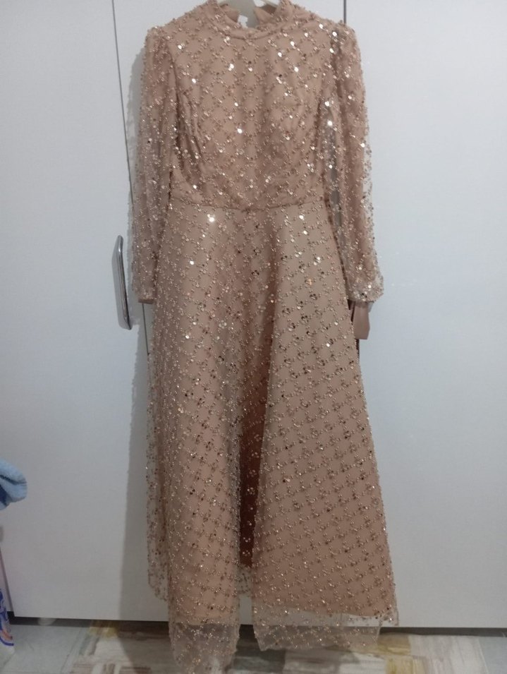 Bu uzun bej abiye elbise, uzun kollu ve bisiklet yaka tasarıma sahiptir. Düzenli kesimi ve parlak payet detaylarıyla düğünler için şık ve gösterişli bir seçenektir. ✨