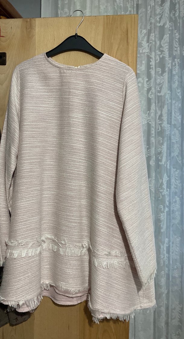 Kadınlar için uzun kollu, uzun boylu salaş kesim tunik. Bej ve gri tonlarda yumuşak sentetik kumaştan, yuvarlak yaka ve fırfır detaylı rahat bir modeldir.