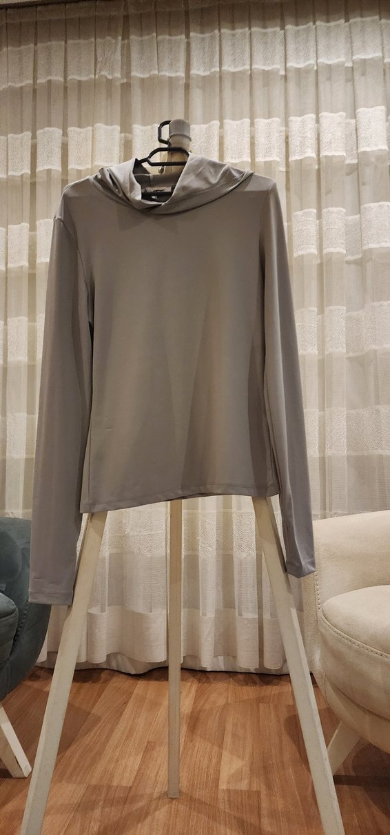 Kadınlar için uzun kollu, yüksek yakalı,spor bluz. Pürüzsüz sentetik kumaştan, bej-gri tonlarında günlük rahat sokak stili. Zahmetsiz şıklık sunar.