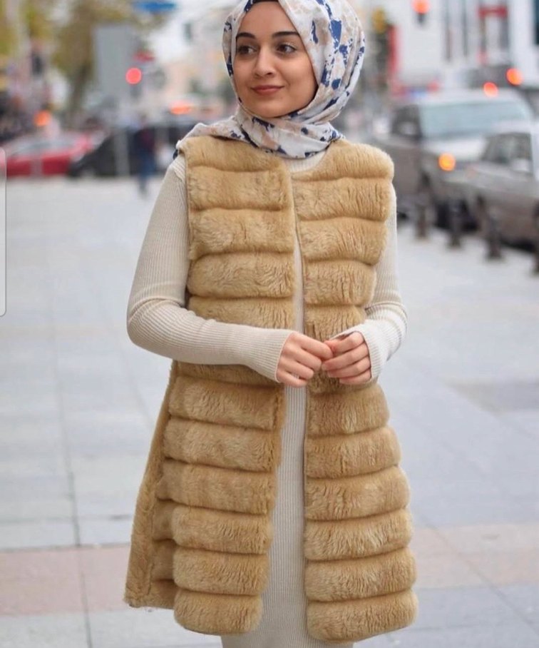 Bej renkte, uzun kesim ve kürk detaylı kadın yeleği. Kolsuz, rahat kesimli ve günlük kullanıma uygun sokak stili.