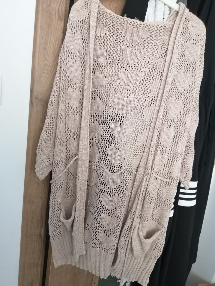 Bej renkli, uzun örgü hırka; bol kesim, V yaka ve uzun kollu, yumuşak örgü kumaştan rahat ve bohem tarzda.
