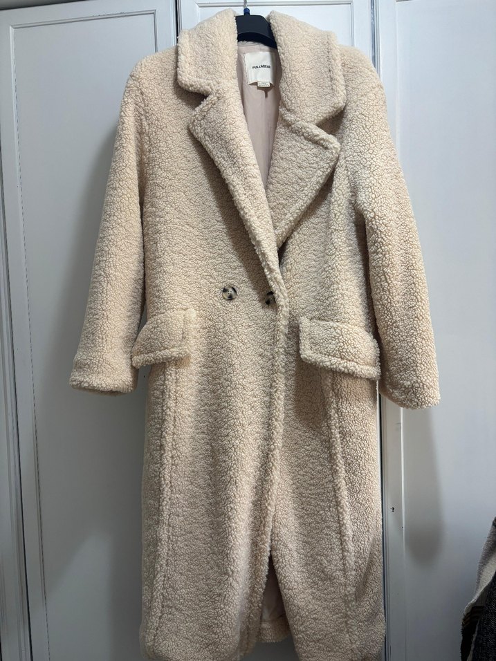 Bej renkte, uzun boy, kürk detaylı ve yumuşak peluş kumaştan yapılmış kadin kaban. Geniş kesim, uzun kollu ve cepli, gündelik kullanım için uygundur. yenidir fakat etiketi koptu