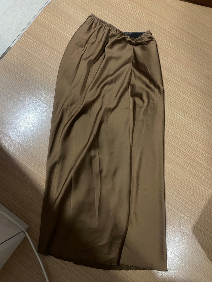 Kadınlar için uzun, salaş kesim ve drapeli tasarıma sahip, saten dokulu koyu bej renkte günlük kullanım için uygun etek.