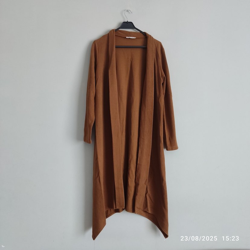 Kadınlar için uzun, bej renkli, salaş kesim ve uzun kollu süet kumaştan yapılmış kaban. Drapeli, notched lapel yakaya sahip, minimalist normcore stil için uygun.