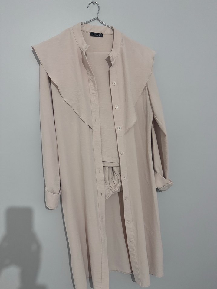 Kadınlar için bej kumaştan, uzun ve bol kesim . Notlu yaka ve uzun kollu, gündelik minimalist sokak tarzına uygun. Takım