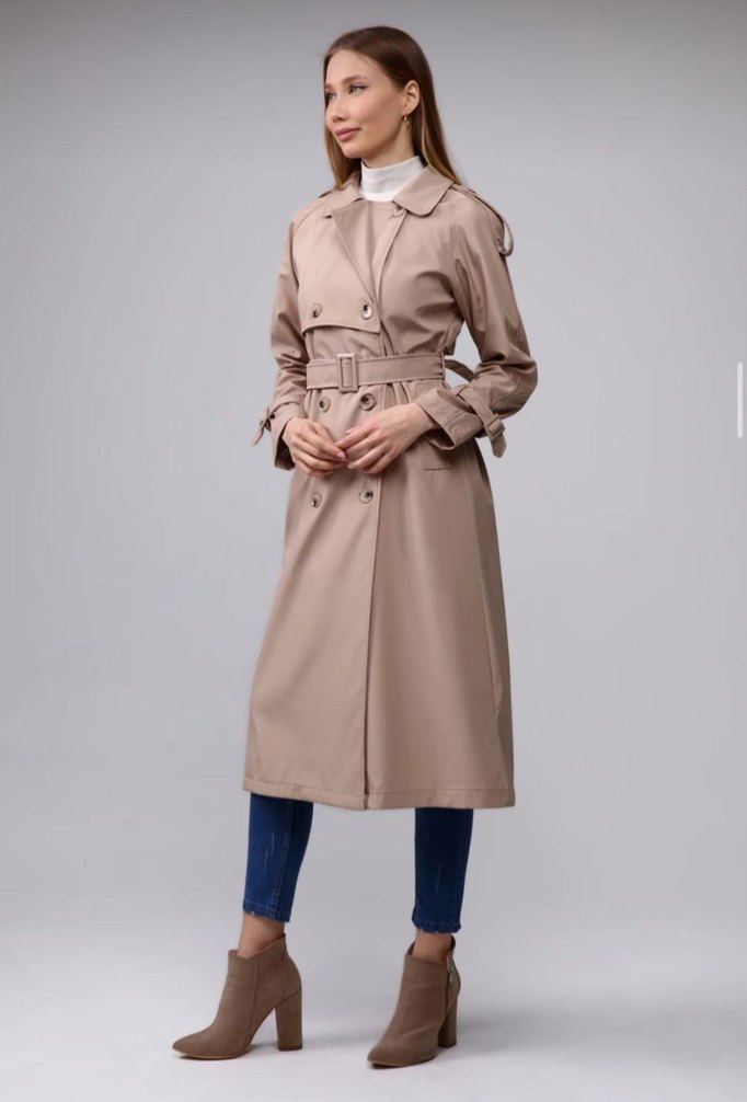 Kadın bej uzun trençkot, kemerli ve klasik yakalıdır. Sentetik kumaştan üretilmiş, uzun kollu ve desen içermeyen rahat kesimdir. Günlük ve sokak tarzı için uygundur.