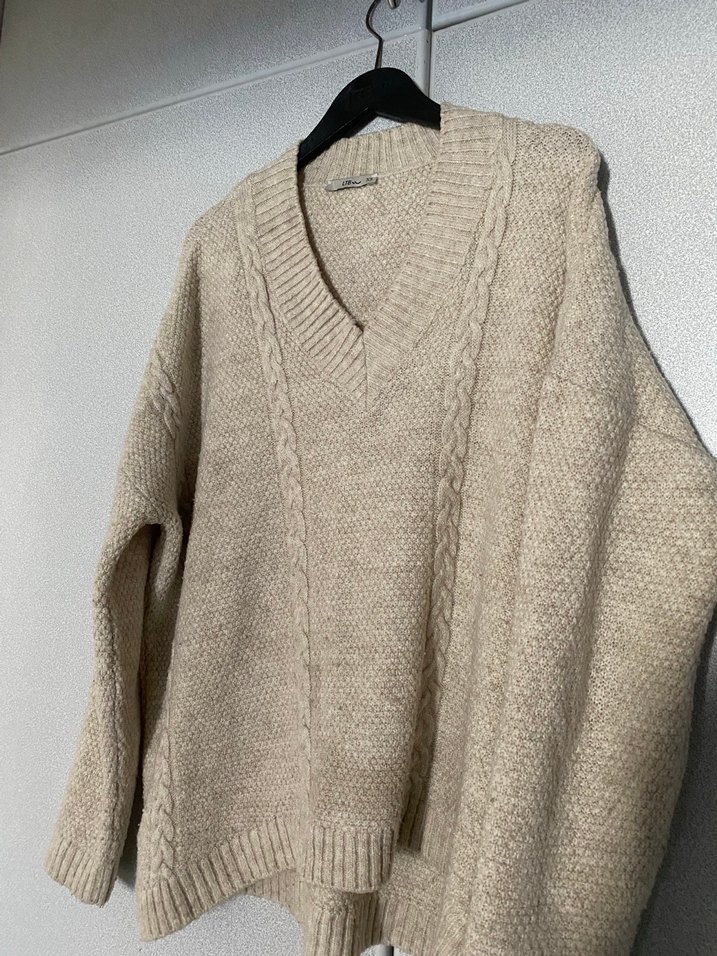 Bej renkli, V yaka ve uzun kollu örgü kazak, bol kesimiyle rahat ve gündelik bir stil sunar.