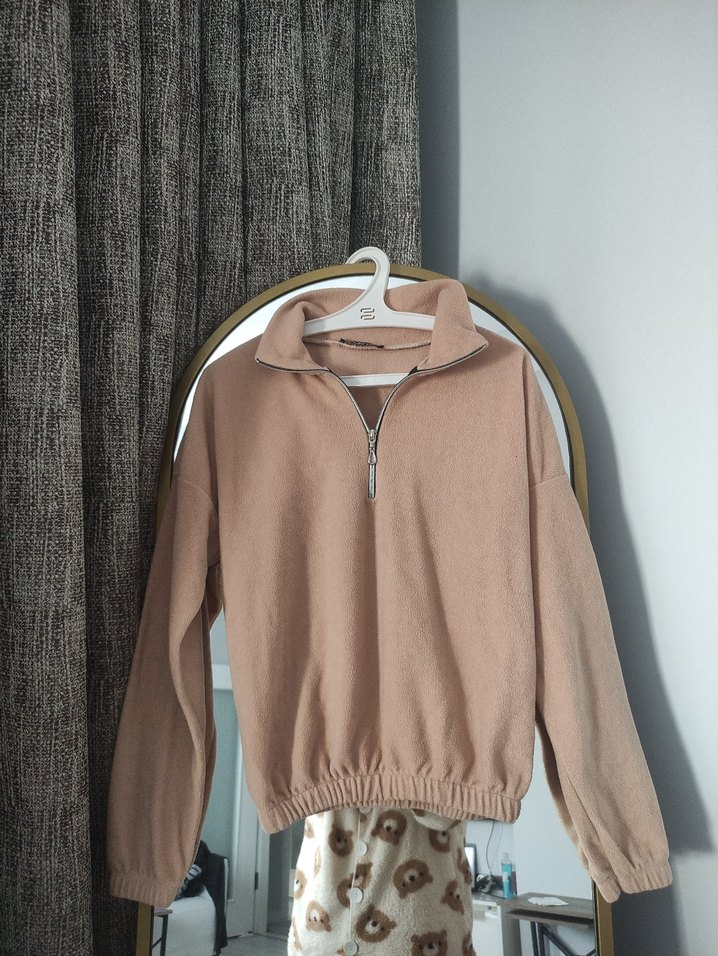 Bu bej kadın sweatshirtü, fermuarlı yüksek yakaya, uzun kollara ve bol kesime sahiptir. Yumuşak ve sıcak kumaştan üretilmiş olup günlük kullanıma uygun rahat bir stil sunar. Pastel tonu sokak modasına uyum sağlar. Hiçbir sorunu yok bir-iki kere giyildi