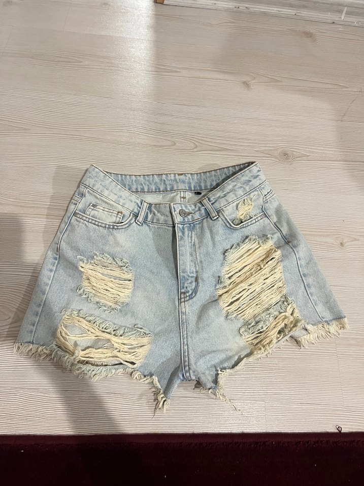 Açık mavi renkli, bol kesim denim şort, yırtık detaylar ve püsküllü kenarlarla günlük rahat ve trend sokak stili sunar.
