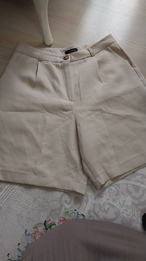 Yumuşak keten kumaştan, bol kesim, minimalist tasarımlı, bej renk yüksek bel kadın şort.
