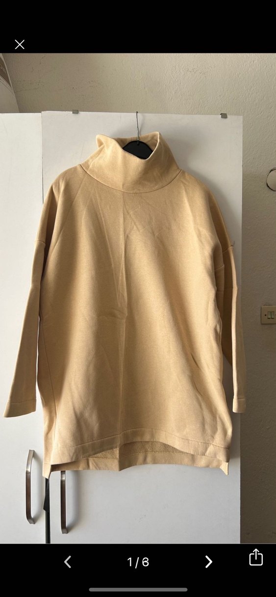 Bej renkte, yüksek yakalı ve uzun kollu, rahat kesim kadın sweatshirt. Yumuşak ve sıcak kumaştan, sade ve desensiz tasarıma sahip, günlük kullanıma uygun.