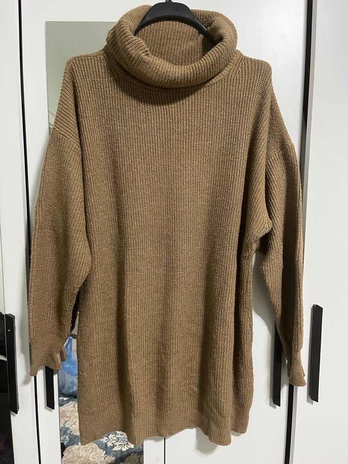Kahverengi yün örgü, balıkçı yaka ve uzun kollu kadın kazak. Rahat kesimi ve midi uzunluğu ile günlük kullanıma uygundur.